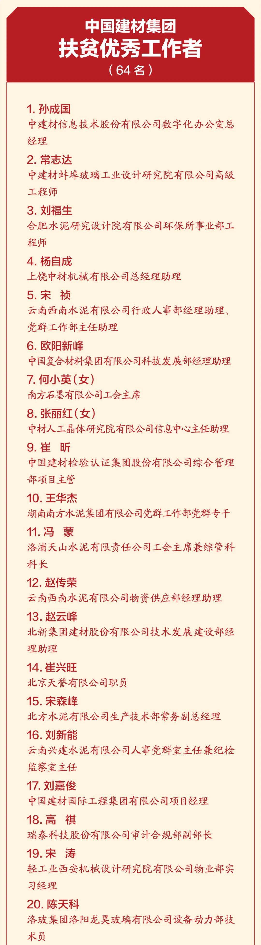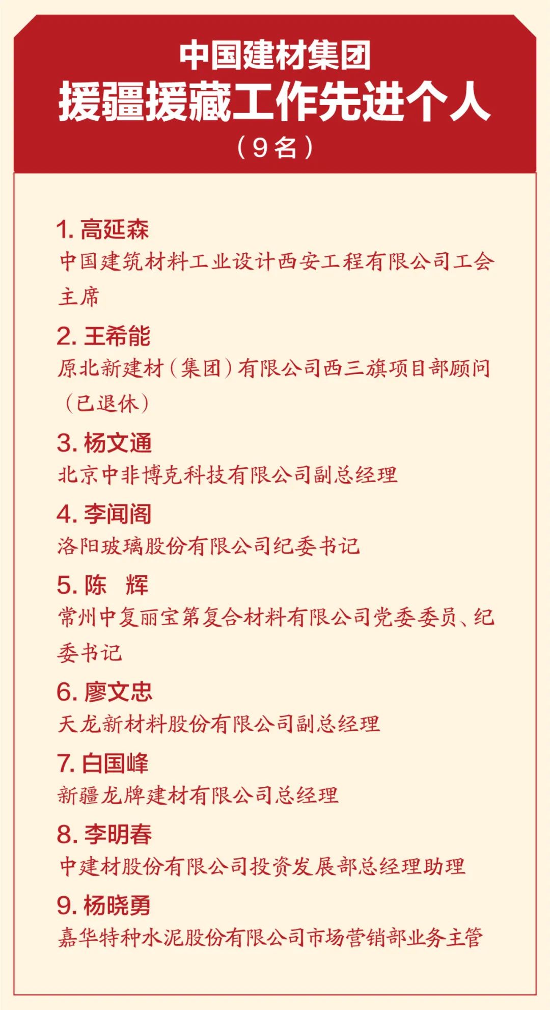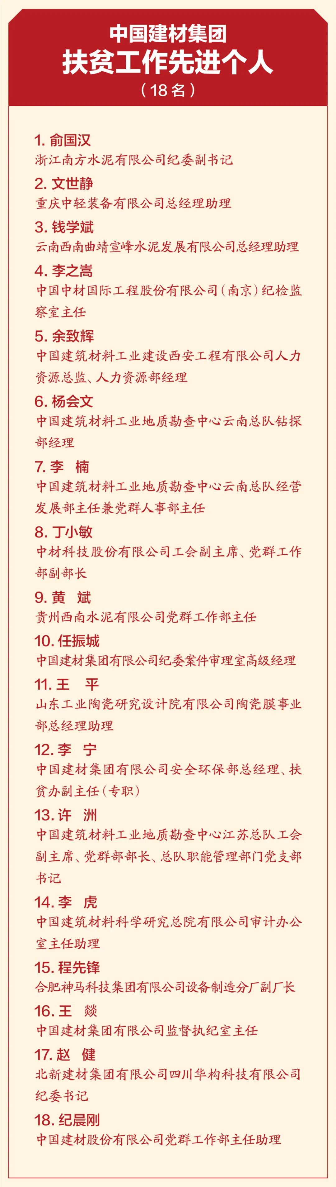 4月19日,中國建材集團扶貧工作暨援疆援藏工作表彰大會在京召開,會議深入學習貫徹習近平總書記重要講話精神,特別是習近平總書記關于扶貧工作的系列重要論述,全面總結集團扶貧工作及援疆援藏工作任務完成情況,表彰集團在扶貧工作和援疆援藏工作中涌現出來的先進個人和集體,并就接續(xù)鄉(xiāng)村振興做好下一階段工作做出安排部署。 中國建材集團扶貧工作紀實片 國資委科技創(chuàng)新和社會責任局副局長張曉紅出席會議并致辭,國家鄉(xiāng)村振興局社會扶貧司定點扶貧處處長周曉云,中國志愿服務基金會副理事長兼秘書長姚桂清出席會議。集團黨委書記、董事長周育先發(fā)表重要講話,集團黨委副書記、董事、總經理曹江林宣讀表彰決定。集團黨委常委、副董事長李新華,黨委副書記孫力實,黨委常委、總會計師詹艷景,黨委常委、紀委書記楊杰,黨委常委、副總經理王于猛、魏如山出席會議。 國資委科技創(chuàng)新和社會責任局副局長張曉紅 張曉紅在致辭中對中國建材隆重召開扶貧工作暨援疆援藏工作表彰大會表示祝賀!對中國建材在脫貧攻堅、援疆援藏工作中取得的成績表示肯定!她指出:中國建材舉全集團之力,盡銳出戰(zhàn),傾心幫扶,在扶貧工作和援疆援藏工作中體現出了“政治站位高、幫扶措施實、干部作風硬、脫貧成效好”四個鮮明特點。希望中國建材繼續(xù)做好鞏固拓展脫貧攻堅成果同鄉(xiāng)村振興有效銜接,充分發(fā)揮中國建材的綜合優(yōu)勢,在落實鄉(xiāng)村振興戰(zhàn)略、助力農村高質量發(fā)展中作出新貢獻,取得新成績。 中國建材集團黨委書記、董事長周育先 周育先在講話中重申了扶貧工作與援疆援藏工作的重要意義。打贏脫貧攻堅戰(zhàn),是全面建成小康社會最艱巨的任務,是以習近平同志為核心的黨中央向國內外做出的莊嚴承諾。援疆援藏工作是貫徹新時代黨的治疆治藏方略的工作要求。中國建材始終堅持聽黨話、跟黨走,不忘初心、牢記使命、勇擔責任,堅決貫徹落實黨中央、國務院和上級有關單位關于脫貧攻堅、援疆援藏工作的各項部署要求。 周育先在講話中從四個方面回顧了中國建材的扶貧工作和援疆援藏工作。一是堅持黨的領導,提高政治站位,強化組織保證。二是突出精準施策,注重因地制宜,提高脫貧實效。三是創(chuàng)新幫扶模式,善用平臺資源,凝聚各方力量。四是嚴格干部選派,加強作風建設,踐行初心使命。他指出:中國建材能取得這樣的成績,根本在于黨的堅強領導、在于全方位精準施策、在于發(fā)揮好自身優(yōu)勢、在于凝聚起各方力量。在投身脫貧攻堅過程中:我們堅決落實以習近平同志為核心的黨中央決策部署,深入學習貫徹習近平新時代中國特色社會主義思想特別是習近平總書記關于扶貧工作的系列重要論述;我們認真落實以人民為中心的發(fā)展思想,堅決把精準扶貧方略落到實處,真扶貧、扶真貧;我們統籌推進企業(yè)發(fā)展與幫扶工作,精準實施六大幫扶措施;我們充分調動干部員工積極性和主動性,舉全集團之力,盡銳出戰(zhàn);我們與幫扶地區(qū)干部群眾同想同干,共謀發(fā)展。在扶貧工作和援疆援藏工作這場大戰(zhàn)大考中戰(zhàn)出了精氣神、考出了好成績。 脫貧摘帽不是終點,而是新生活、新奮斗的起點。2021年是十四五的開局之年,是全面實施鄉(xiāng)村振興戰(zhàn)略的起步階段。周育先要求:要以落實中央各項決策部署為根本,落實中央關于鄉(xiāng)村振興、援疆援藏的工作要求;落實集團幫扶政策,圍繞六大幫扶措施進行統籌安排;關心關愛幫扶干部,支持他們的工作,使幫扶干部心無旁騖的投入鄉(xiāng)村振興工作。要以黨史學習教育為契機,學史明理、學史增信、學史崇德、學史力行,不忘共產黨人的初心使命,大力弘揚脫貧攻堅精神,團結一心,英勇奮斗,與定點幫扶地區(qū)一起做好鞏固拓展脫貧攻堅成果與鄉(xiāng)村振興有效銜接工作,乘勢而上,再接再厲,接續(xù)奮斗,以優(yōu)異成績獻禮建黨百年! 中國建材集團黨委副書記、董事、總經理曹江林 曹江林宣讀表彰決定,黨的十八大以來,集團積極響應習近平總書記號召,認真貫徹落實黨中央、國務院和上級有關單位關于脫貧攻堅決策部署,集全集團之力,盡銳出戰(zhàn)、合力攻堅。2020年我國脫貧攻堅戰(zhàn)取得了全面勝利,區(qū)域性整體貧困得到解決,完成了消除絕對貧困的艱巨任務。集團定點幫扶的五個縣區(qū)已脫貧出列,援疆援藏工作也取得了階段性成果。為表彰在脫貧攻堅及援疆援藏工作中涌現出的先進個人和先進集體,充分展現脫貧攻堅成效成果,經集團黨委研究決定:授予中國建材股份有限公司等19家成員企業(yè)“扶貧工作先進單位”稱號,授予俞國漢等18名同志“扶貧工作先進個人”稱號,授予高延森等9名同志“援疆援藏工作先進個人”稱號,授予孫成國等64名同志“扶貧優(yōu)秀工作者”稱號。 永善縣委書記戈昌武 石臺縣委書記李軍 永善縣委書記戈昌武代表定點幫扶縣區(qū)發(fā)言,石臺縣委書記李軍宣布:為感謝中國建材對石臺縣的幫扶,石臺縣誠摯邀請中國建材員工來石臺旅游觀光。 趙健、白國峰、高鵬濤分別發(fā)言 寧夏涇源縣大灣鄉(xiāng)楊嶺村第一書記趙健、第九批中央企業(yè)援疆干部白國峰、扶貧工作先進單位代表高鵬濤分別代表受表彰的扶