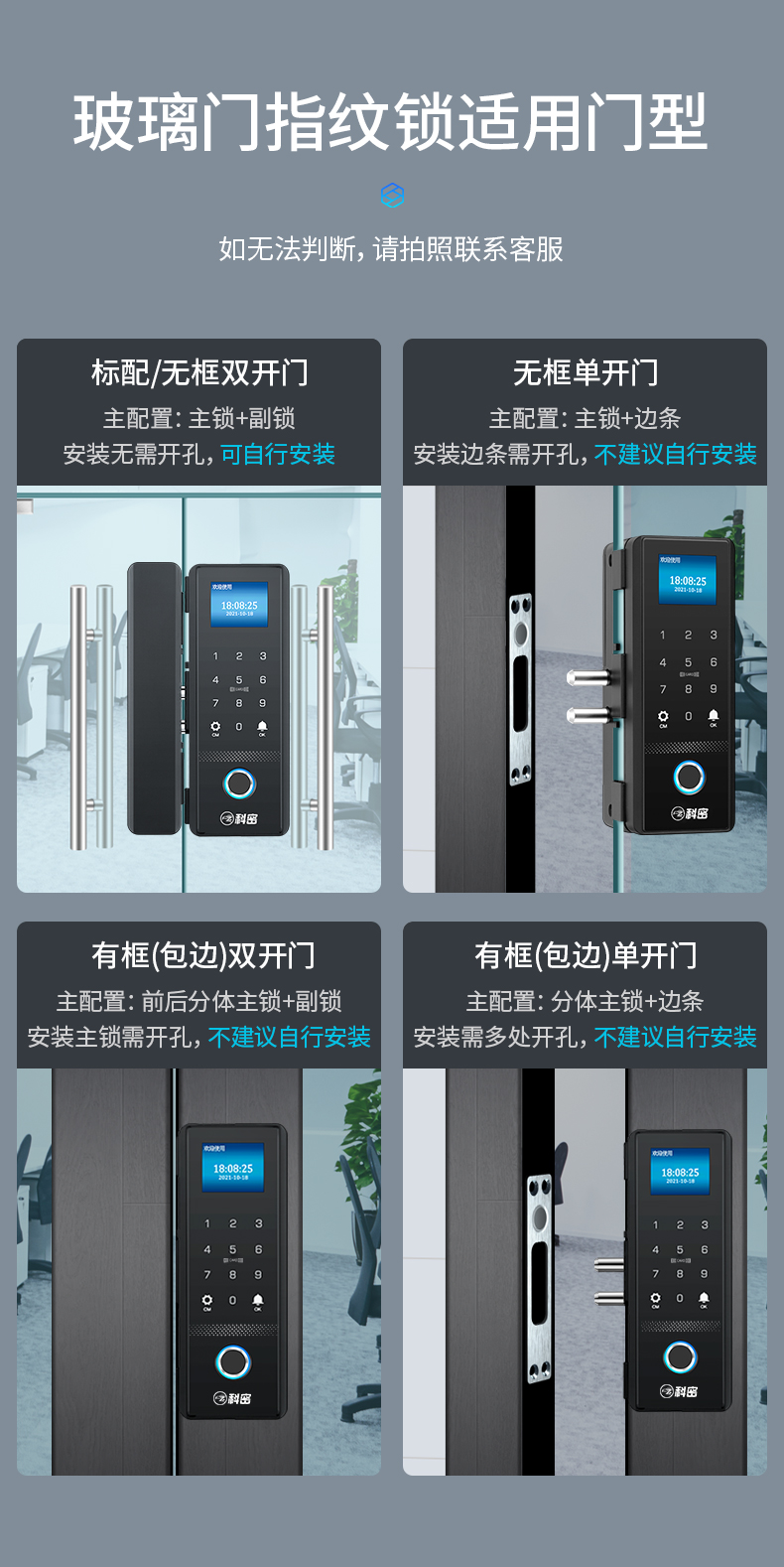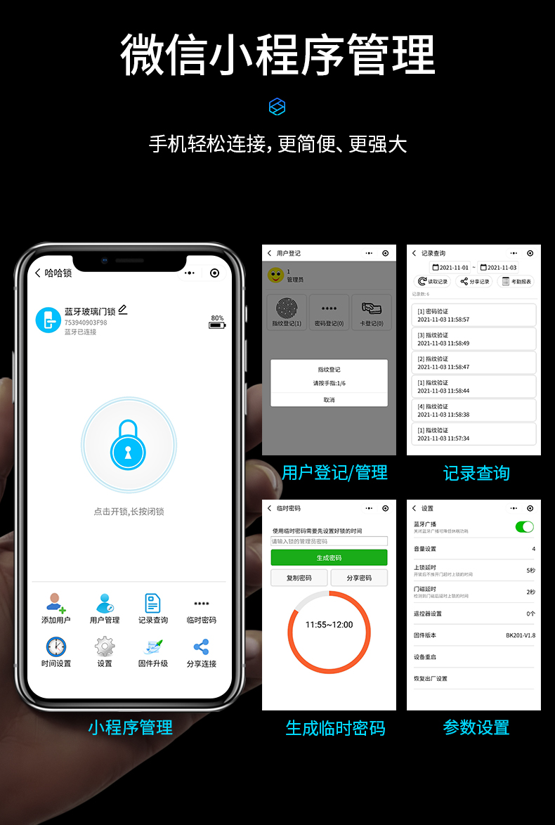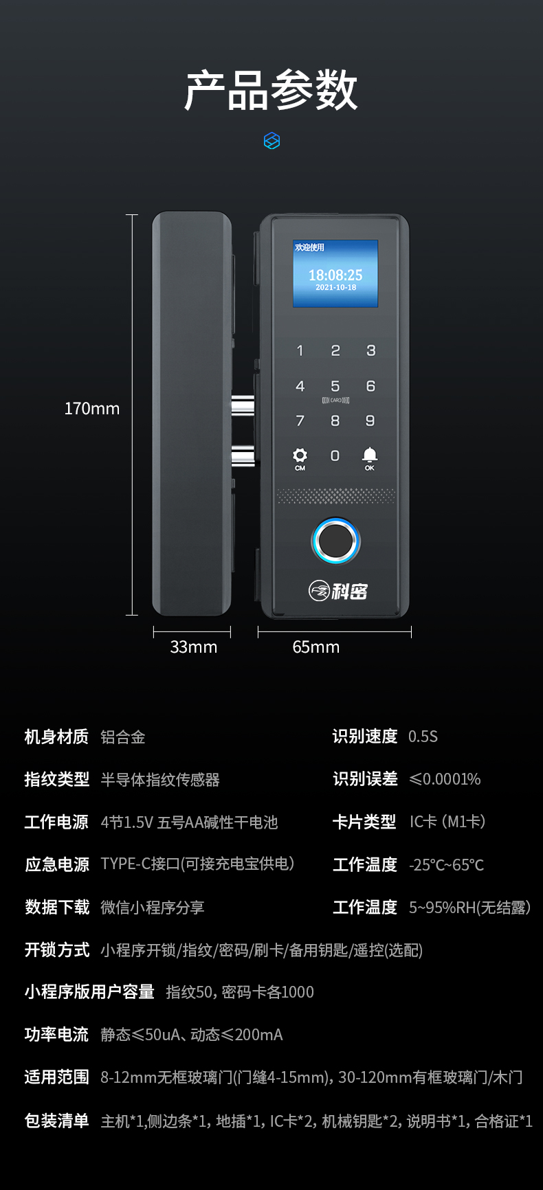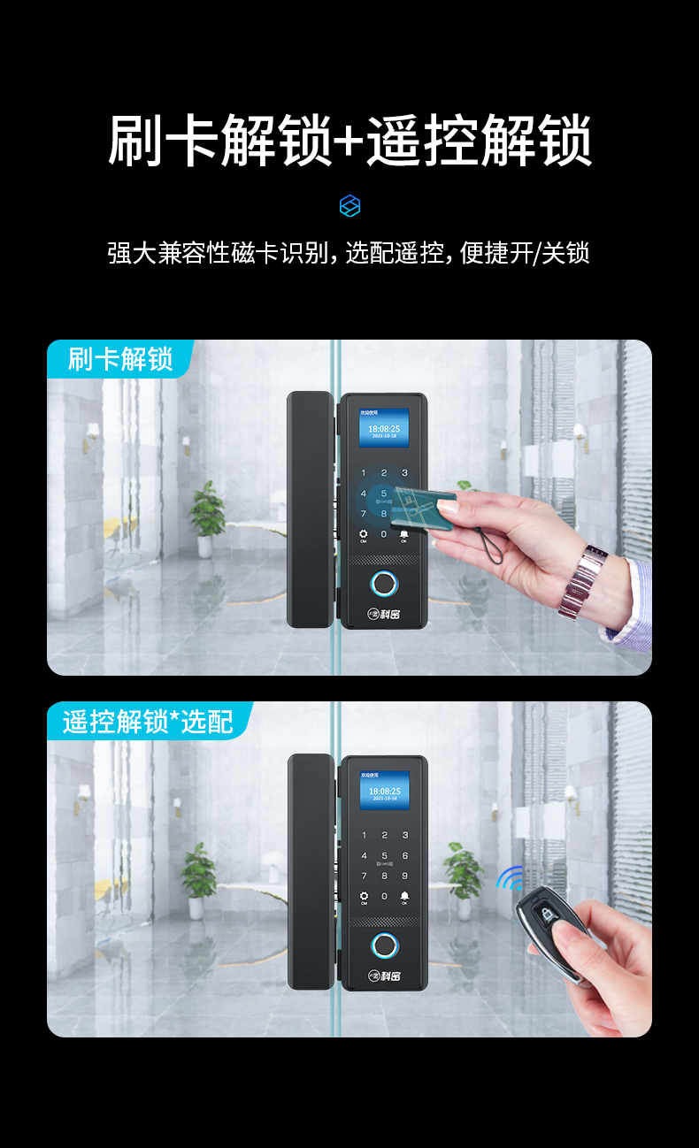科密(comet)玻璃門指紋鎖智能電子密碼鎖辦公室玻璃門鎖免開孔布線藍(lán)牙小程序考勤應(yīng)急鑰匙COM-168A